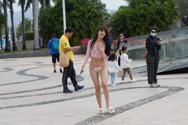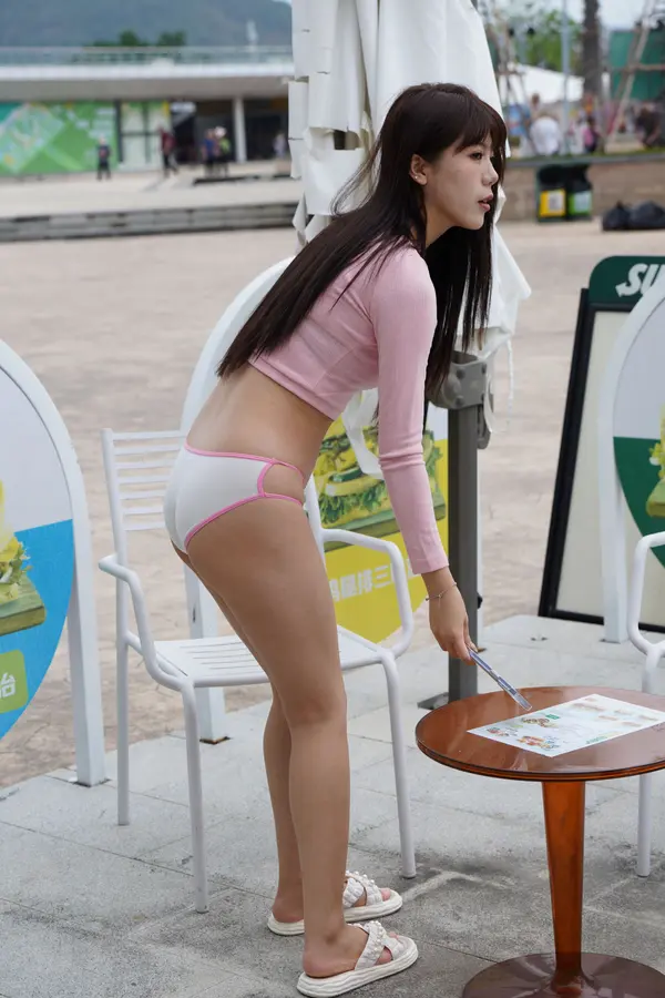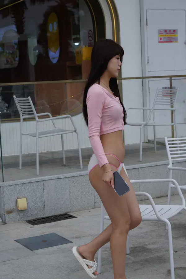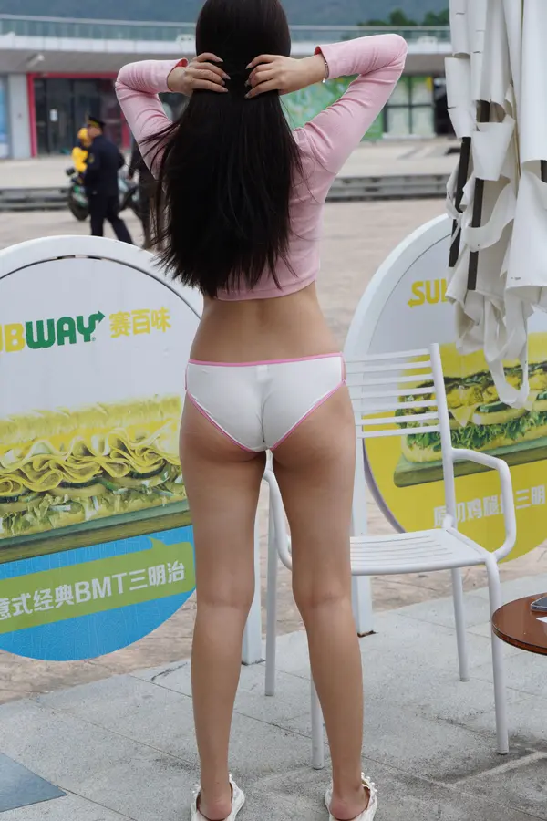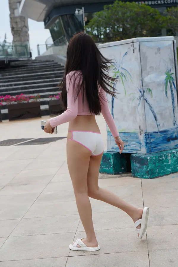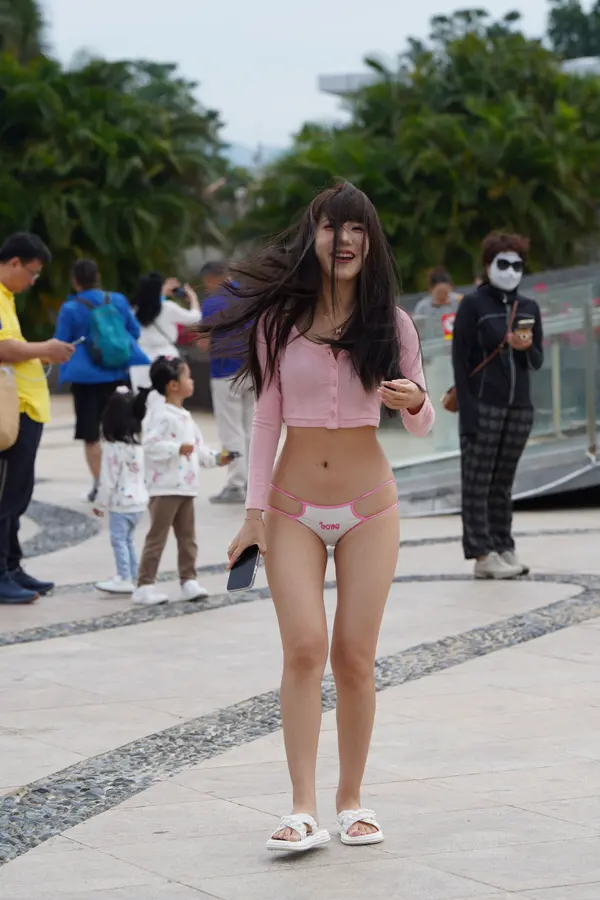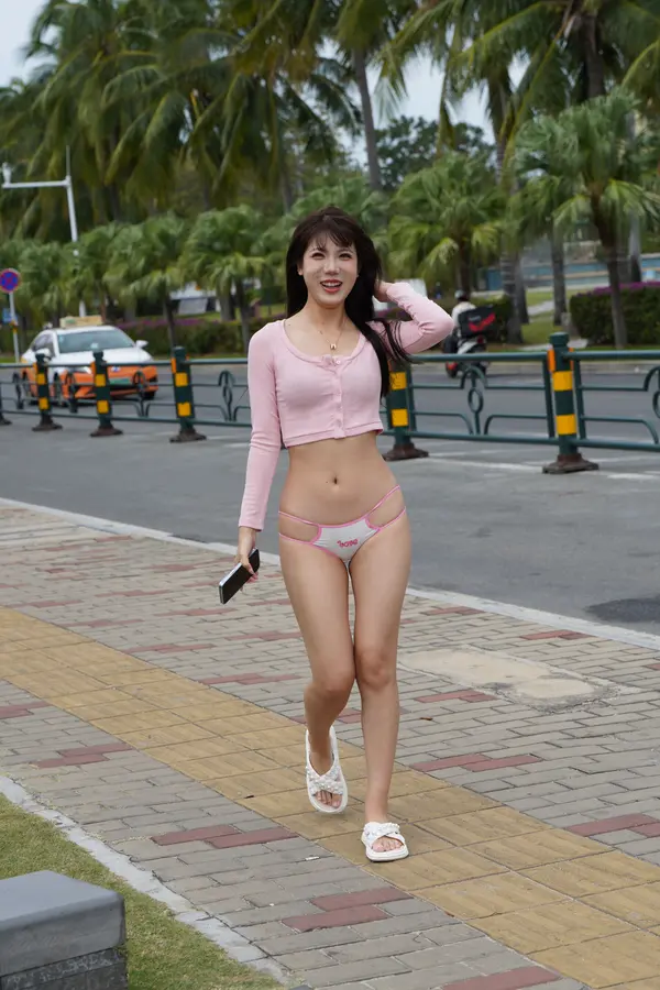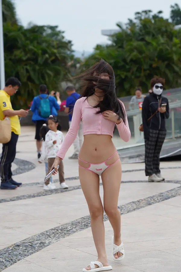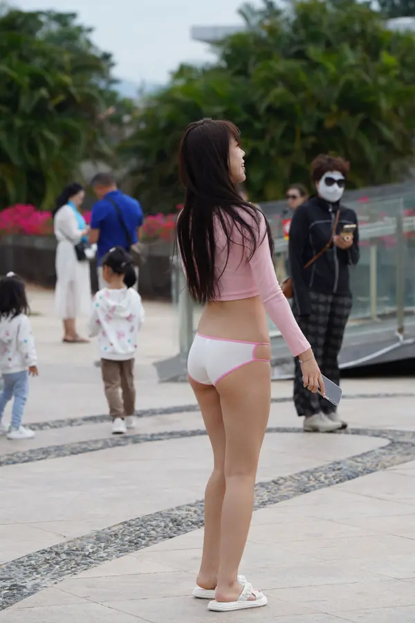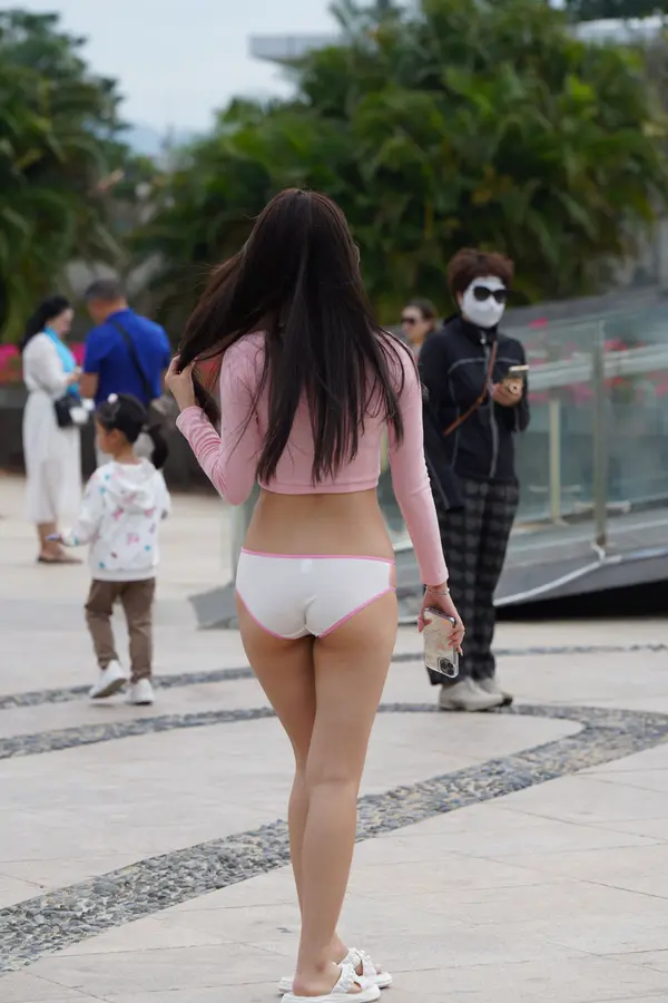 在海边街道穿着内裤逛